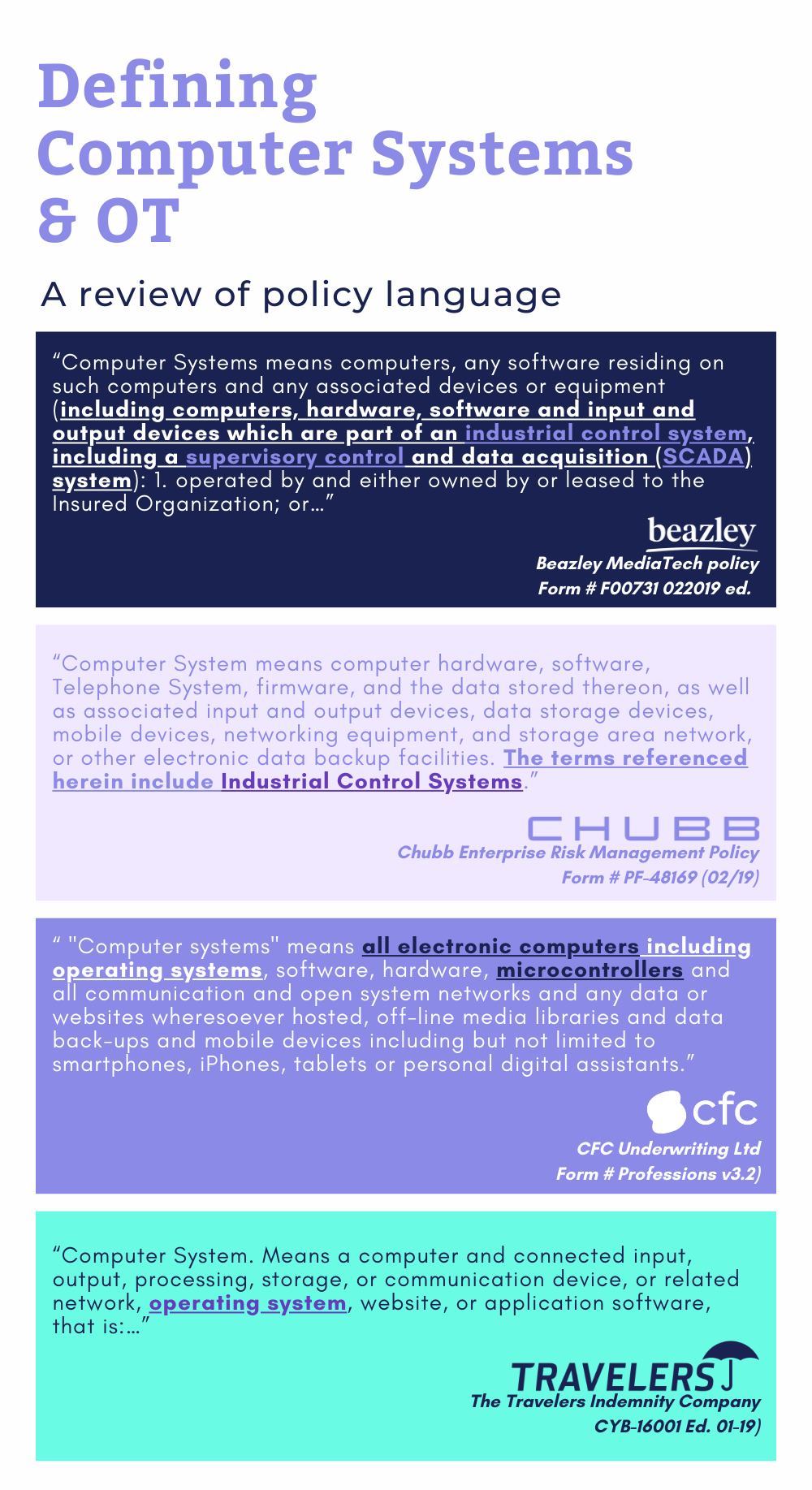 Insurers who fail to conduct effective underwriting and collaborate with their clients may be unexpectedly exposed to operational technology (OT) cyber risks. Similarly, insured individuals or companies may find themselves in a difficult situation without proper support. In response, several insurers have introduced operational technology supplemental applications or added OT underwriting questions to their ransomware supplemental application. These measures have become increasingly crucial as cyber insurers now consider operational technology (OT) as part of the definition of computer systems. As a result, they provide coverage for certain cyber event consequences, including business interruption.